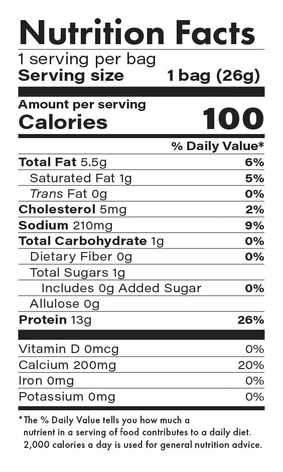 Ingredients: Milk Protein Isolate, High-Oleic Sunflower Oil, Natural Flavor, Cheddar Powder, Salt, Vegetable Juice (color), Buttermilk Powder, Cayenne Powder, Yeast Extract, Tapioca Fiber, Lactic Acid, Keto Sweetener Blend (Allulose, Monk fruit).
